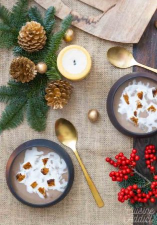 Les soirs d’hiver, c’est si agréable de savourer un délicieux velouté de légumes ! Mais pourquoi ne pas en mettre aussi au menu du réveillon ? Ce velouté de châtaignes aux croutons de pain d’épices à l’air tellement savoureux