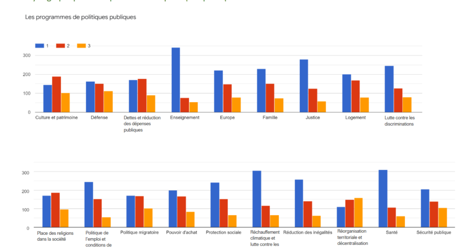 - Sur 525 réponses, il apparait que plus de 60% des personnes classent l’enseignement, la santé et le réchauffement climatique/la lutte contre les pollutions comme grandes priorités des politiques publiques.