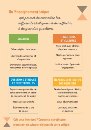 Ni un éveil à la foi, ni un enseignement purement historique, les cours de culture religieuse protestante sont conçus pour inscrire la religion dans le tissu d’autres matières enseignées. C’est faire place à la Bible et à son influence sur l’art, la littérature et l’histoire. C’est proposer des méthodes de lecture plurielles. C’est établir un lien entre la religion comprise comme transcendance et un certain nombre de valeurs. C’est donner de l’espace pour la pluralité des religions.