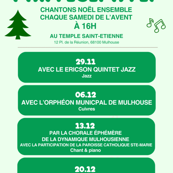 • Samedi 13 décembre – 16h — Avec la Chorale éphémère de la paroisse protestante de la Dynamique mulhousienne, et la participation de la paroisse catholique Sainte-Marie : chant & piano dans la convivialité…