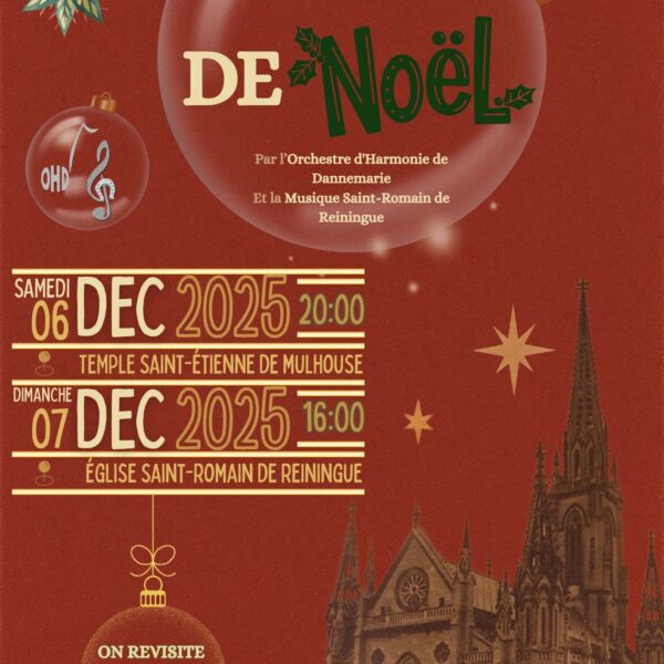 Cette année, la Musique Saint-Romain de Reiningue et l’Orchestre d’Harmonie de Dannemarie vous proposent un concert de Noël pas comme les autres!