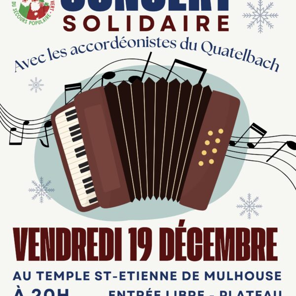 En partenariat avec le Temple Saint-Étienne de Mulhouse, le Secours populaire du Haut-Rhin organise un concert solidaire, qui se tiendra le vendredi 19 décembre à 20h. Inscrit dans la programmation de l’Avent du Temple, cet évènement mettra à l’honneur les accordéonistes du Quatelbach, basés à Sausheim.