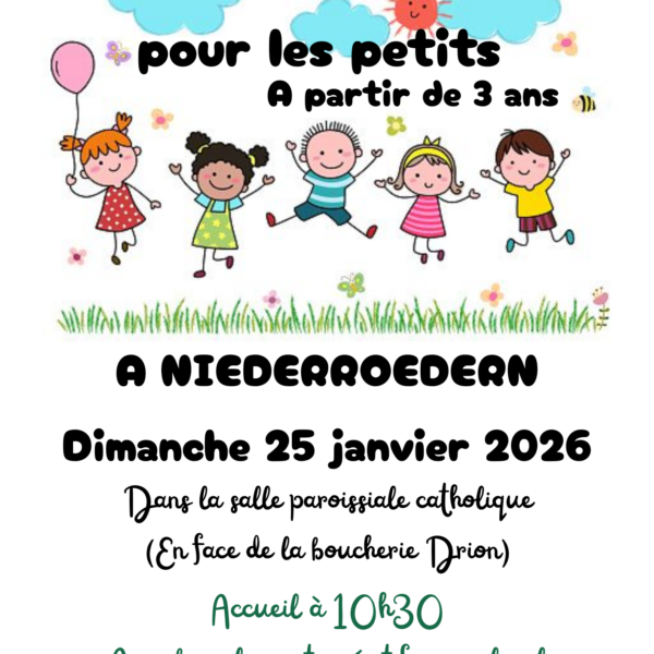 la paroisse protestante de Niederroedern organise un culte oecuménique pour les petits à partir de 3 ans, le dimanche 25 janvier dans la salle paroissiale catholique (En face de la boucherie Drion)