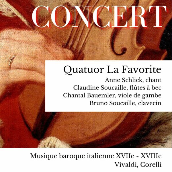 Le quatuor à cordes, La Favorite, composé de Anne Schlick, chant ; Claudine Soucaille, flûtes à bec ; Chantal Bauemler, viole de gambe et Bruno Soucaille, clavecin propose une escapade vers l’apogée de la musique baroque italienne au XVIIIe siècle, le samedi 18 avril 2026 à 18h au temple de Guebwiller.