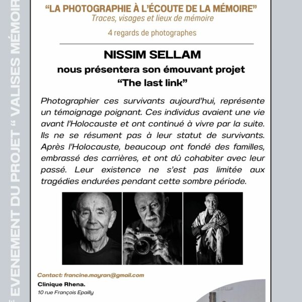 Nissim Sellam présentera son projet « The Last Link », les derniers survivants de la Shoah photographiés, mercredi 4 mars 2026 à 19h, Clinique Rhéna. Photographier ces survivants aujourd’hui, représente un témoignage poignant. Ces individus avaient une vie avant l’Holocauste et ont continué à vivre par la suite. Ils ne se résument pas à leur statut de survivant. Après l’Holocauste, beaucoup ont fondé les familles, embrassé des carrières et ont dû cohabiter avec leur passé. Leur existence ne s’est pas limitée aux tragédies endurées pendant cette sombre période.