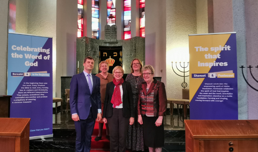 Dans la synagogue d’Esch-sur-Alzette, le rabbin Alexander Grodensky, l’universitaire Debbie Weissman, la théologienne et pasteure Ursula Rudnick, Sœur Katarzyna Kowalska et Evelyne Will-Muller, représentante de la Fédération luthérienne mondiale. ©DR